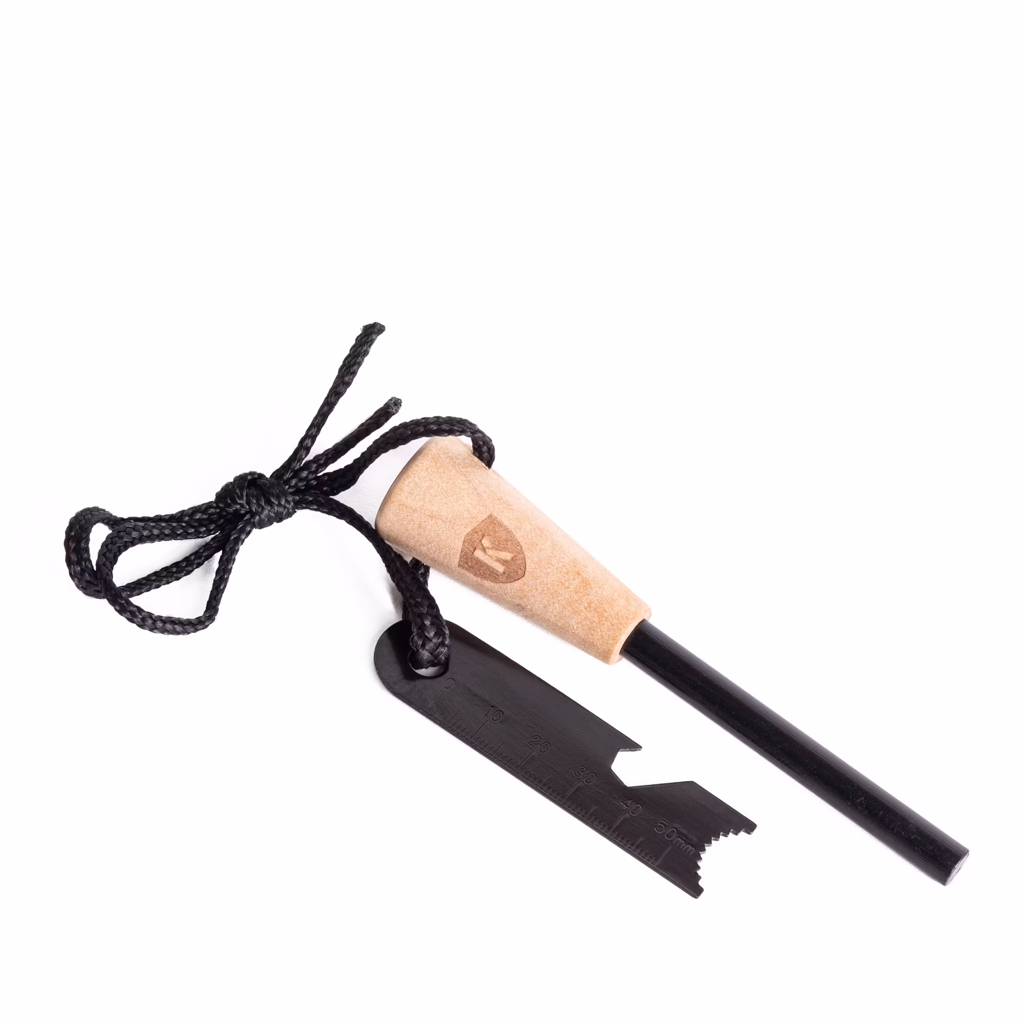 Robuster Feuerstahl mit Holzgriff. Mit dem beiliegenden Metallblatt oder einem Messer kann man Funken erzeugen, um leicht entzündbares Material zu entzünden.